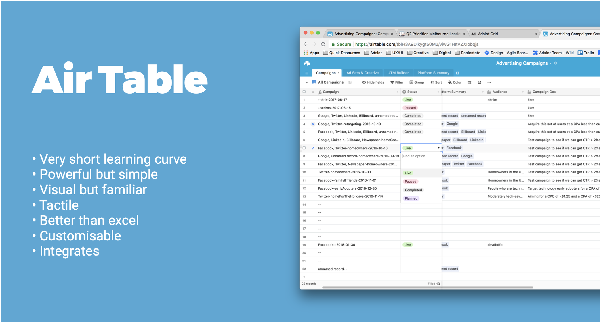 At the heart of Adslot products are grids of advertising data that needs to be created, explored, sliced up, and exported by users in a variety of ways. This is done as they progress through the many stages of planning and executing Advertising Campaigns. The current state of the grid system varied from product to product and had fallen out of step with Industry best practices set by companies such as Excel, Google Sheets and Airtable.